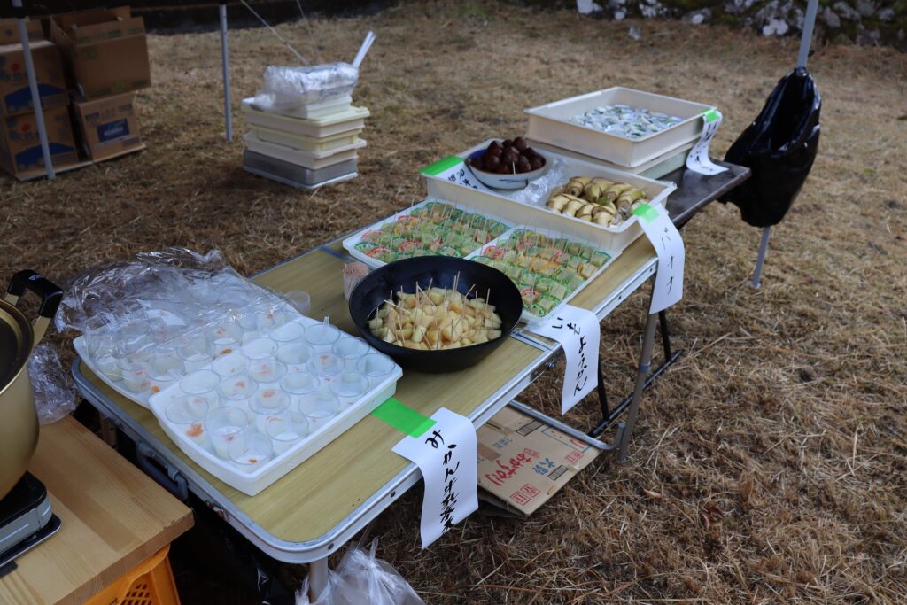第1関門の様子です。こちらは、第3関門もかねています。勢いよく通りすぎる選手の場合、三脚を倒しそうになることもあるそうで、この辺りは改善が必要かもしれません。なかなか難しいです。それにしてもエイドにはおいしそうなものが並んでいました。