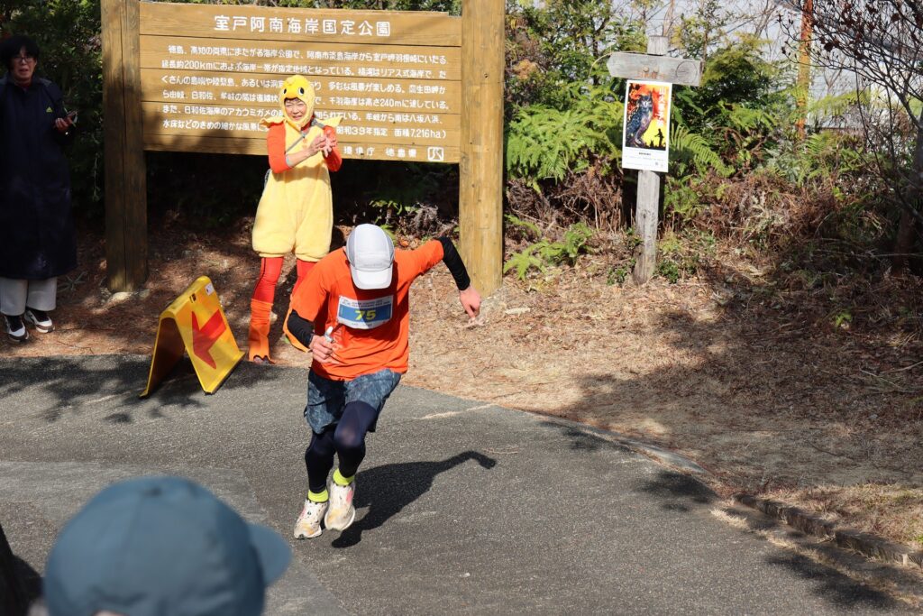 こちらは、選手が駆け抜けるゴール地点です。美波町のシンボルでもある日和佐城近くの町営の施設です。写真の右脇に山道があり、気持ちよく駆け抜けた後に、左に急カーブして、舗装の坂道を駆け抜けてゴールとなります。