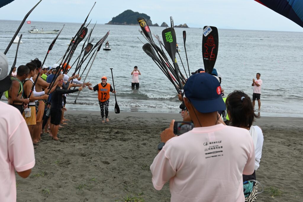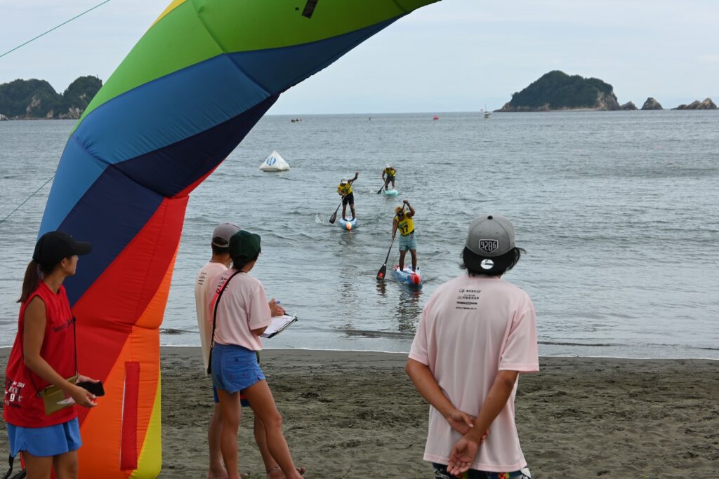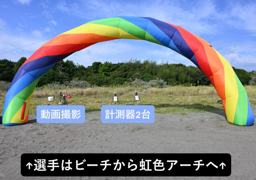 ゴールは、虹色アーチです。選手は海からあがって、ボードから降り、パドルだけ持って虹色アーチへ向かいます。アーチ脇に順位チェックのスタッフがいて、手動で順位を確定します。その後、計測器へタッチを行い、タイムが確定します。