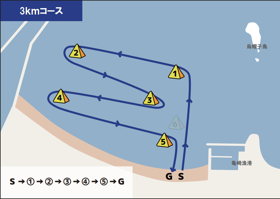 漕ぐ距離とボードの種類によってたくさんのクラスがあります。距離としては、500m、1km、3km、6kmの4種類です。冒頭の写真のようにスタート前にビーチに整列して、30秒前の合図がなったら、ボードを持ち所定の位置まで進み、スタートの合図で一斉に入水というスタートです。参考に3mのコースがこれです。