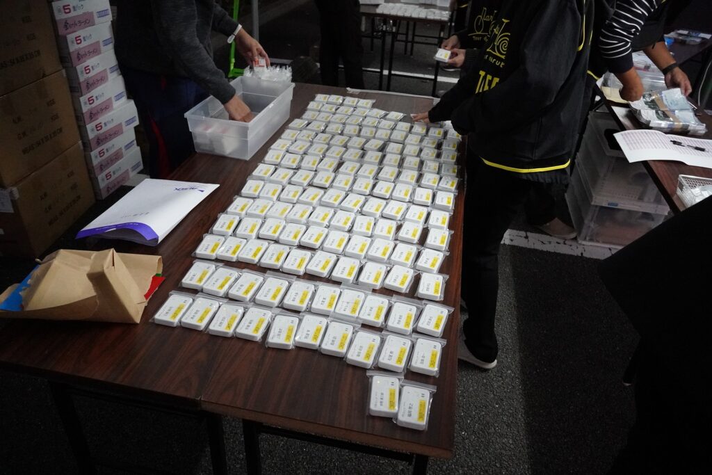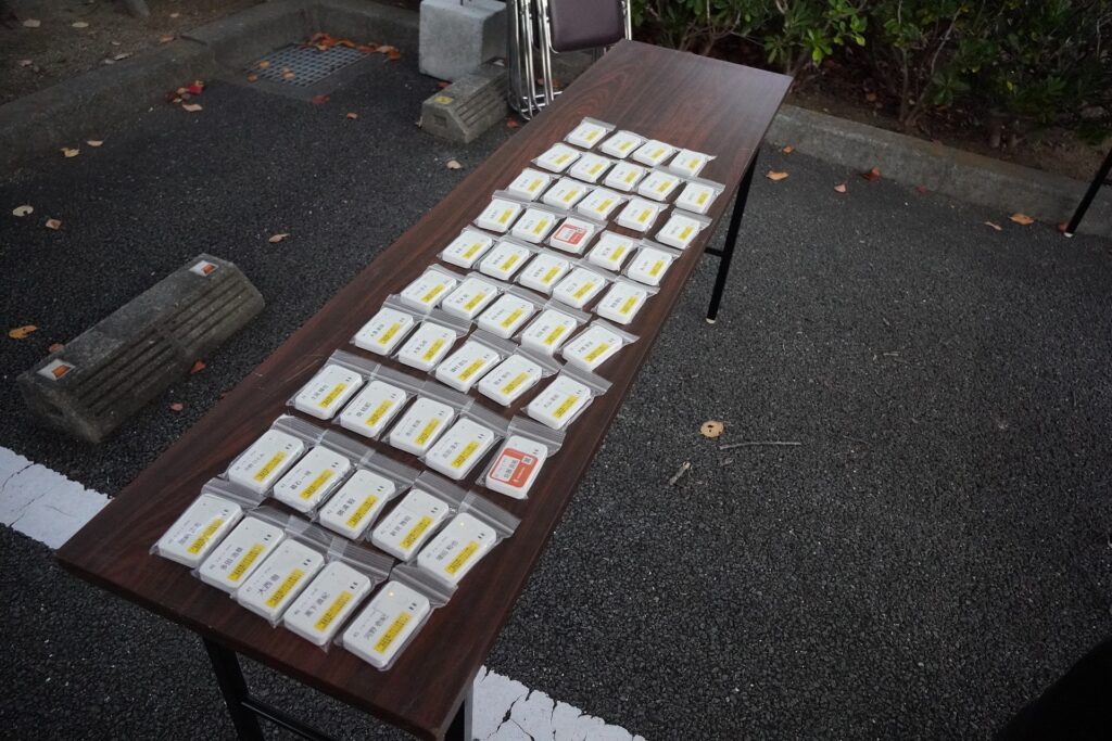 参加者が来られる前に、受付がスムーズに進むにように、GPS端末の電源を入れて順番に並べておきます。参加者が300名以上となり、台数が多いため故障の可能性も高くなりますので、この時点で問題のある端末を発見したら、準備した予備機と交換を済ませておきます。