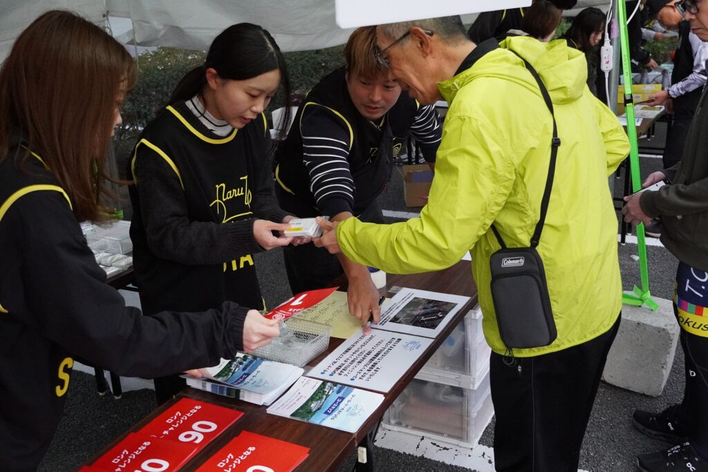 受付スタッフの方々が、参加者の方々に参加する上での様々な注意事項を説明をされてGPS端末を渡しています。