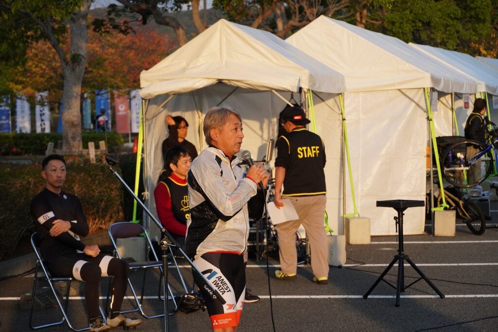 開会式がはじまりました。今回は豪華なゲストライダーがいらっしゃいました。元F1ドライバーの片山右京さん、徳島県出身のBMXライダーの「キング」森崎弘也さんです。右京さんは、多少体調を崩されているとのことでしたが、どうしても鳴門を走りたいということで参加されたということでした。