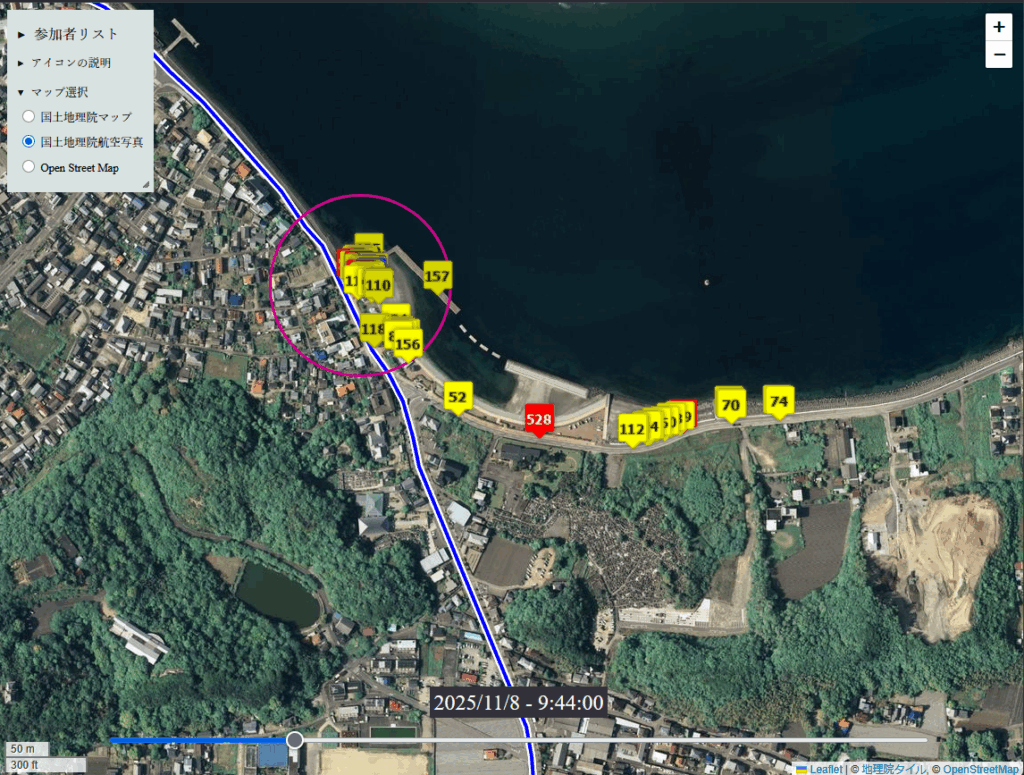 多くの参加者コースから外れているのが観測されました。参加者は青の線を上から下に通ります。ピンク線で囲ったところがエイドステーションで、多くの参加者が集まっています。本来、青の線を下の方に行くのが正解ですが、海岸線を行く参加者が多くいました。