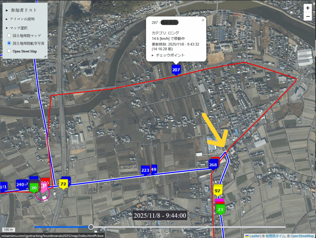 ここで、207番をクリックすると、軌跡が赤線で表示されます。右下から青線を上に行くのが正解ですが、その時点で間違っています。黄色の矢印の地点では逆走していることになり、案内看板に気づけなかったのでしょう。この方へは大会本部から携帯電話へ連絡して、コースを外れていることを伝え、コースに戻る方法を案内いただきました。スタッフライダーも近くにいなかったのでGPS位置情報がなければ不可能なサポートとなりました。