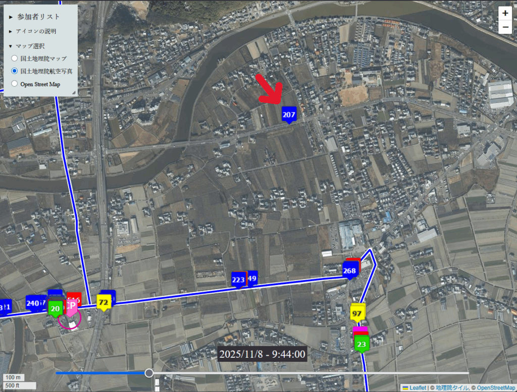 さらに、大きくコースを外れている参加者を発見しました。赤矢印の207番の方です。青線がコースなので大きく外れているのがわかります。